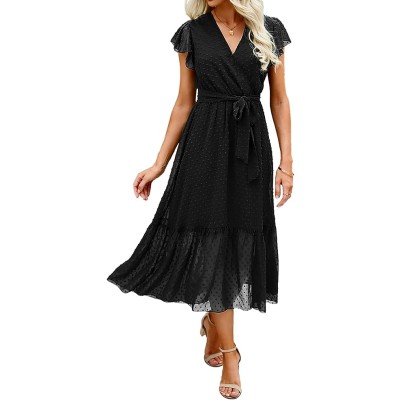 Women Summer Floral Casual Wrap V Neck Ruffle Cap Sleeveless Belt A-Line Pleated Hem Swing Midi Sun Dress
