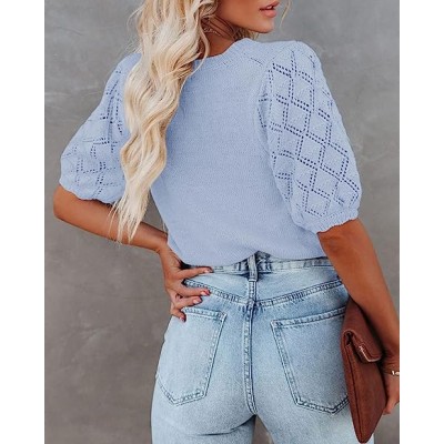 Womens Short Sleeve Sweaters Crewneck Knit Pullover Tops Casual Lightweight Crochet Blouse Shirt